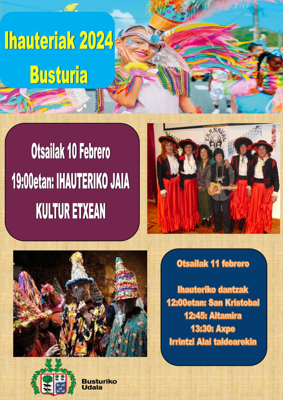 Busturia. Busturiko Udalak antolatuta, Ihauterietako jaia egongo da, otsailaren 10ean (zapatua), 19:00etan, Kultur Etxean. Otsailaren 11n, bestalde, Irrintzi Alai dantza taldea arduratuko da herria girotzeaz: herriko auzo ezberdinetan ihauterietako dantza ikuskizuna eskainiko dute.