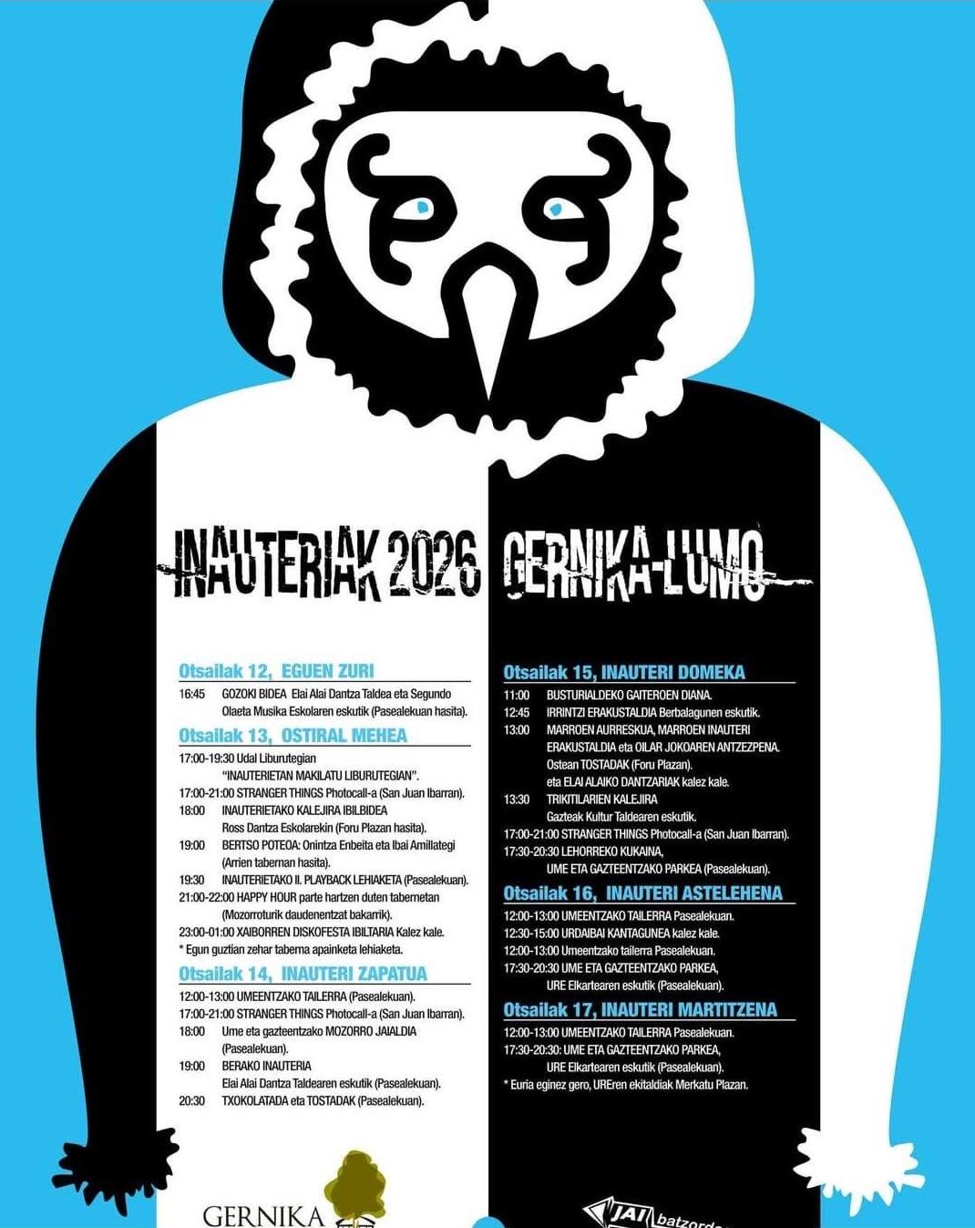 Gernika-Lumo. Gernika-Lumoko inauteriak otsailaren 12an (eguena) hasiko dira, eta inauteri martitzenean, otsailaren 17an, amaituko dira. Tradizioz betetako jaiak izango dira.