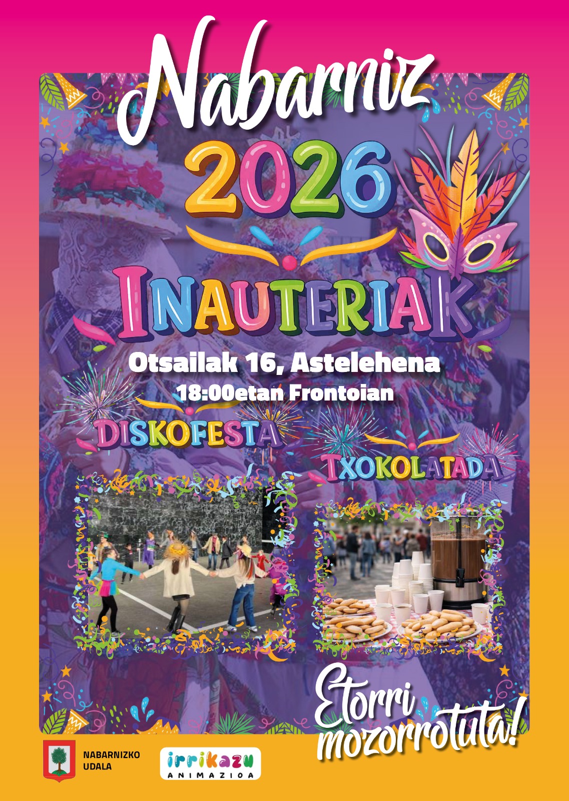 Nabarniz. Inauterietan murgilduko dira otsailaren 16an (astelehena) Nabarnizen: 18:00etatik aurrera, diskofesta eta txokolate jana izango dituzte frontoian.