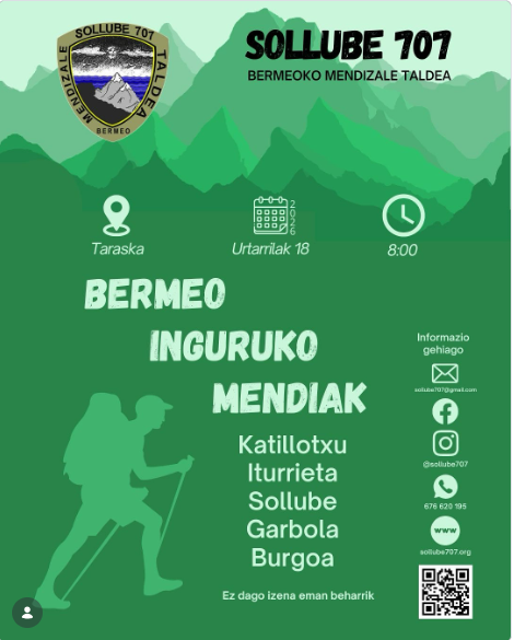 Bermeo. Sollube 707 Bermeoko Mendizale Taldeak Bermeo inguruko mendiak ezagutzeko ibilaldia prestatu du urtarrilaren 18an [domeka]. Taraskan jarri dute hitzordua 08:00etan, Katillotxu, Iturrieta, Sollube, Garbola eta Burgoa mendiak zeharkatzeko. Ez da aurretik izena eman behar.