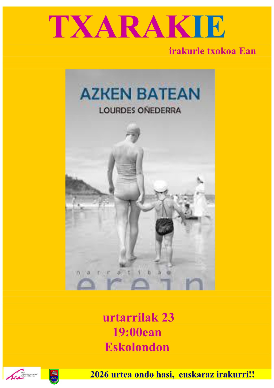 Ea. Lourdes Oñederraren Azken Batean liburua izango dute hizpide, Eako Txarakie Irakurle Txokoan, urtarrilaren 23an. 19:00etan jarri dute hitzordua, Eskolondon.