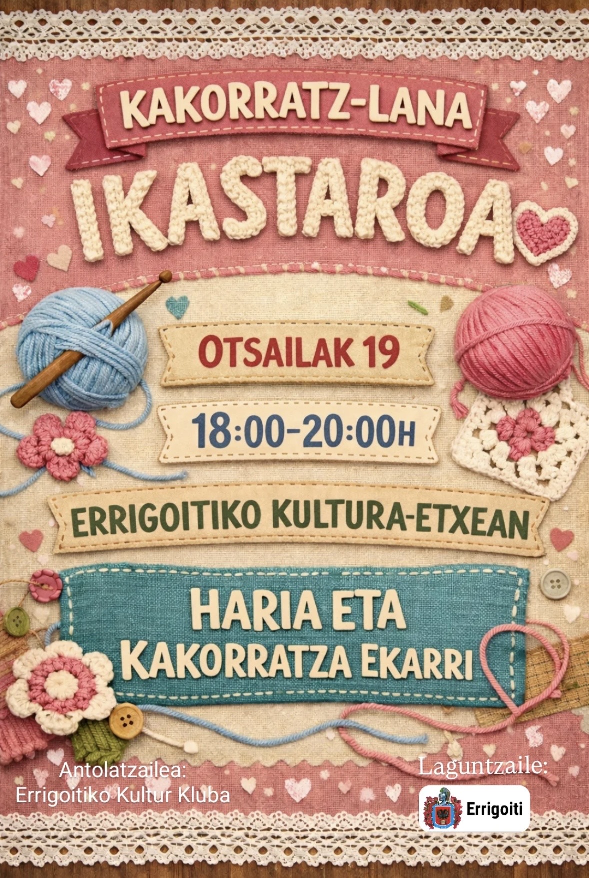 Screenshot Errigoiti. Kakorratz-lana ikastaroan batuko dira otsailaren 19an (eguena) Errigoitiko kultur etxean; 18:00etatik 20:00etara arteko ordutegia ezarri dute, eta haria eta kakorratza eroateko deia egin du ikastaroa antolatu duen Errigoitiko Kultur Klubak.