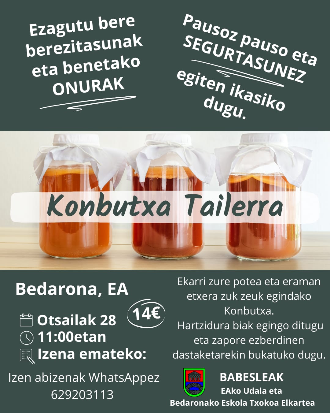 Ea. Konbutxa tailerra antolatu dute Ean, zapaturako (otsailak 28). Bedaronako txokoan jarri dute hitzordua, 11:00etan. Antolatzaileek gogoratu dute izena ematea beharrezkoa dela, eta horretarako 629 20 31 13 telefono zenbakia ahalbidetu dute, whatsapp bidez izen emateak errazteko. Etxetik poteak eramateko eskatu dute, horrela tailerrean bakoitzak egindako konbutxa etxera eramateko aukera egongo dela.