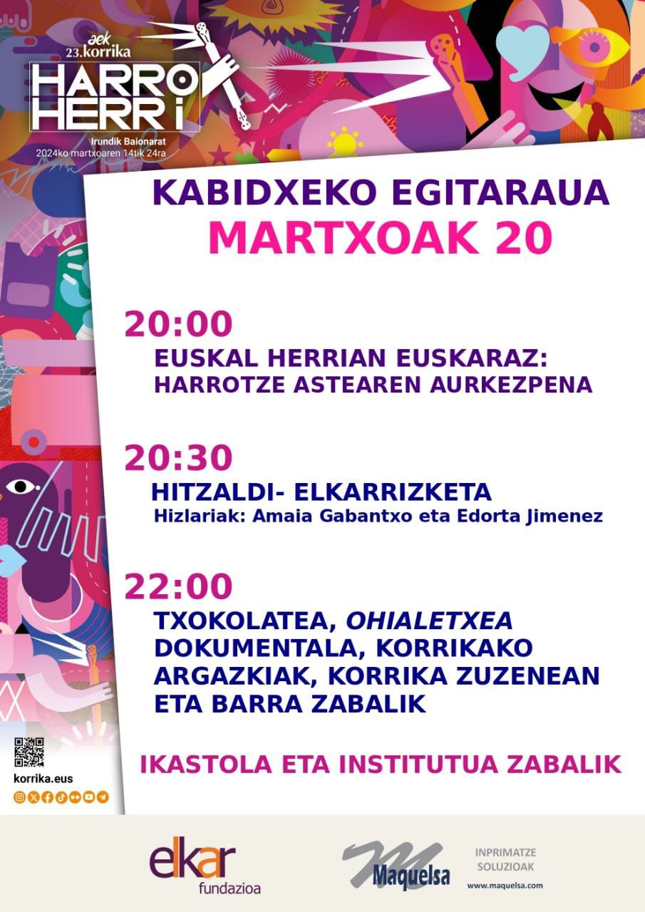 - 22:00. Txokolatea eskainiko da, Oihaletxea dokumentala jarriko dute, Korrikako argazkiak ikusgai egongo dira eta Korrika zuzenean ikusteko aukera egongo da.