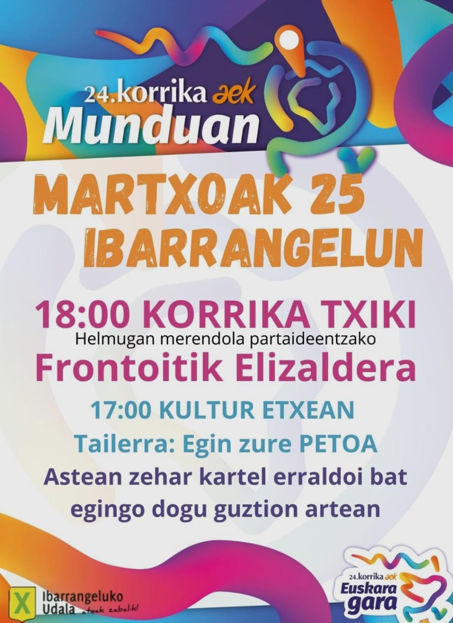 Ibarrangelu. Ibarrangelutar gazteenek korrika txiki egingo dute, 18:00retan hasita. Lehenago, 17:00etan, nork bere petoa egiteko tailerrean bilduko dira. Astean zehar, herritarrek kartel erraldoia egingo dute auzolanean.