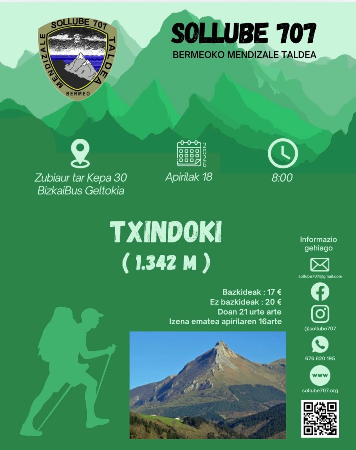 Bermeo. Sollube 707 Bermeoko Mendizale Taldeak Txindokira mendi irteera antolatu du apirilaren 18an [zapatua]. 08:00etan ipini dute hitzordua, BizkaiBus geltokian (Zubiaur tar Kepa, 20).