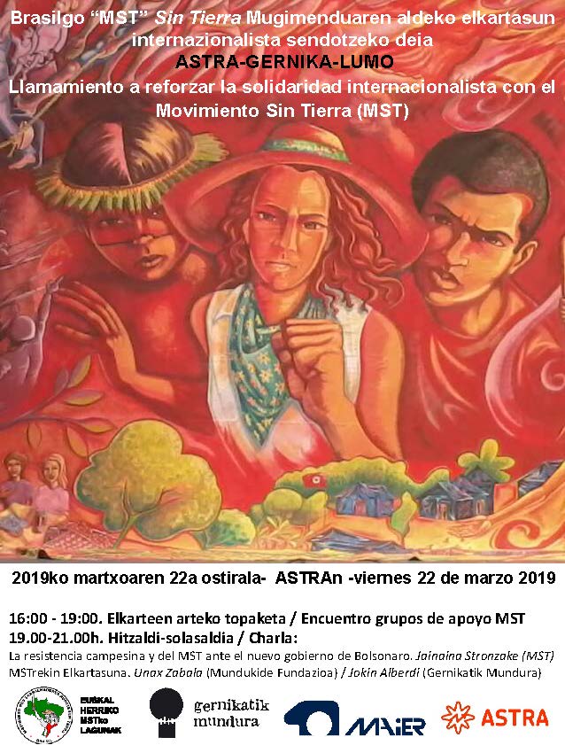 Brasilgo MST Sin Tierra mugimenduaren aldeko elkartasun topaketa egingo dute martxoaren 22an, Gernika-Lumon. Astran izango da topaketa, 16:00etatik 19:00etara. Ostean, 19:00etatik 21:00etara, hitzaldia izango da. MST-ko kide Jainaina Stronzakek Bolsonaroren gobernuaren aurrean MSTren eta nekazarien erresistentziari buruz ariko da. Bestalde, MSTrekin elkartasuna izango dute mintzagai Mundukide Fundazioko Unax Zabalak eta Gernikatik Mundurako Jokin Alberdik.