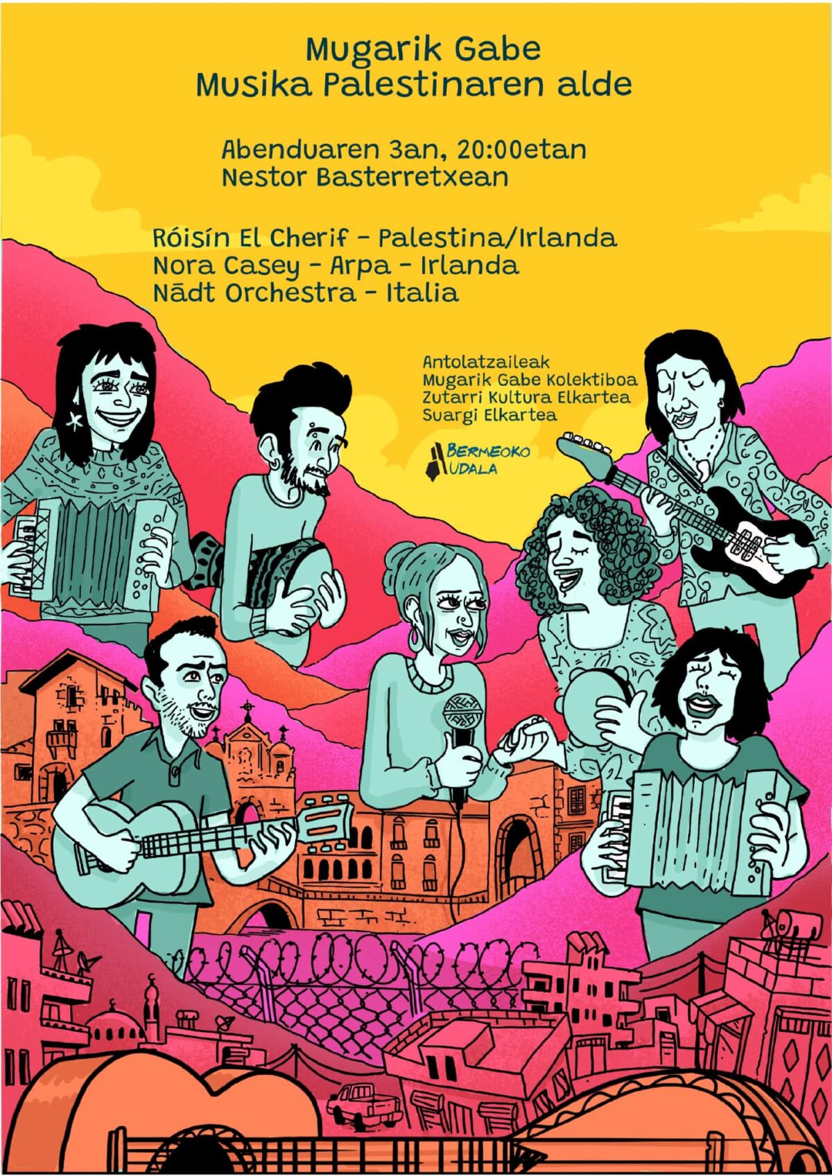 Bermeo. Mugarik Gabe Kolektiboak, Zutarri Kultura Elkarteak eta Suargi Elkarteak Bermeoko Udalaren laguntzaz antolatuta, Mugarik Gabe-Musika Palestinaren alde kontzertua egongo da abenduaren 3an [eguaztena], 20:00etan, Nestor Basterretxea aretoan.