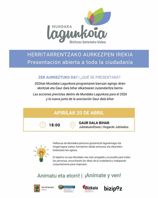 Mundaka. Mundaka Lagunkoia proiektua herritarrei aurkeztuko diete hilaren 20an, 18:00retan hasita, Jubilatuen Etxean. Gaur Dala Bihar elkartearen zuzendaritza talde berria ere eratuko dute.