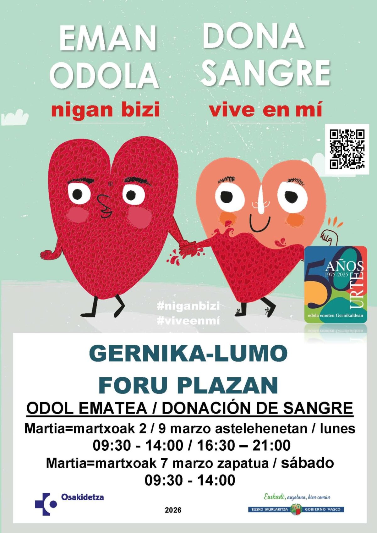 Gernika-Lumo. Foru plazak odola emateko zerbitzu hartuko du hilaren 2an, 7an eta 9an. 2an zein 7an, astelehenez, 09:30etik 14:00etara eta 16:30etik 21:00etara artean egongo da autobusa; 7an, zapatuz, 09:30etik 14:00etara bitartean.