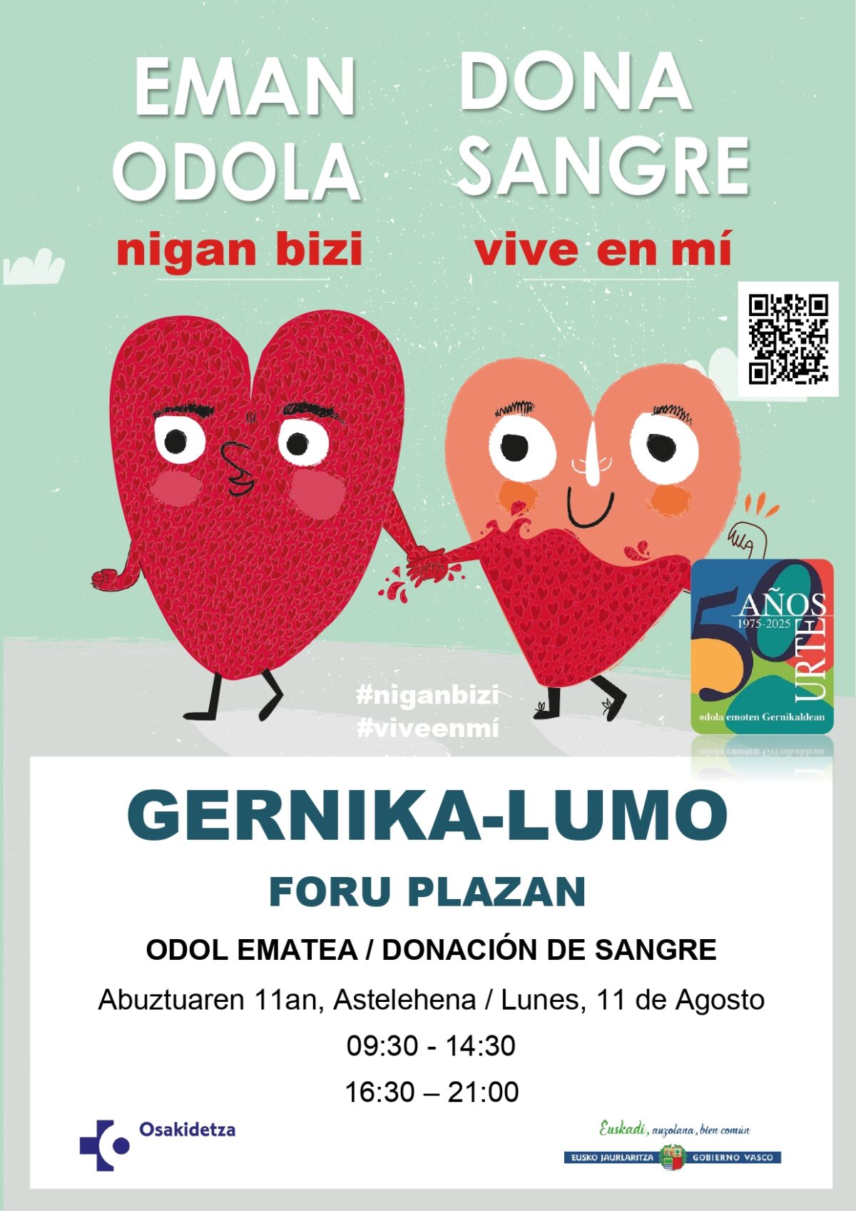 Gernika-Lumo. Odola emateko aukera egongo da Foru plazan. Goizeko txanda 09:30etik 14:30era artekoa izango da; arratsaldekoa, 16:30etik, 21:00etara.