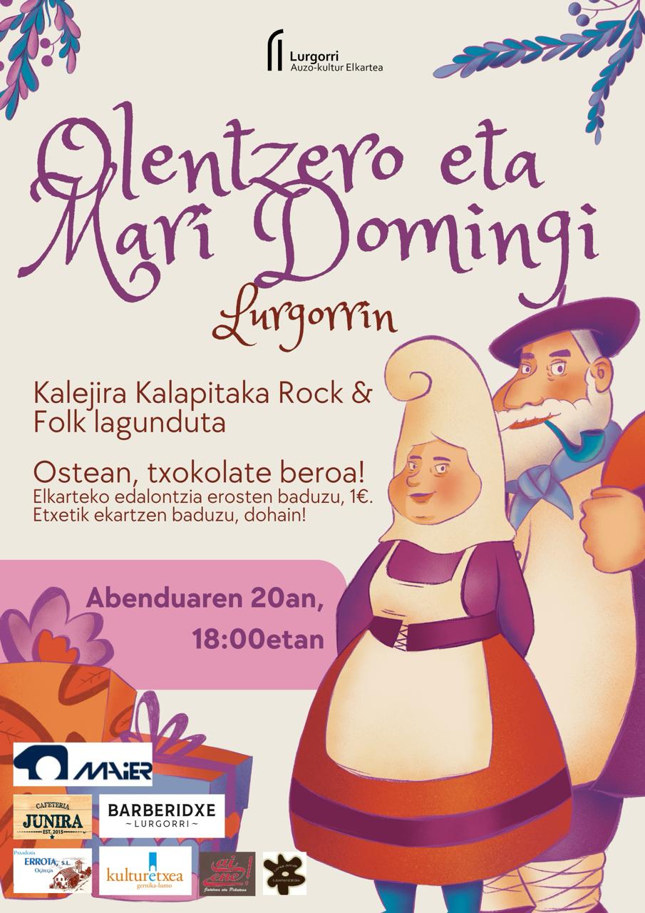 Gernika-Lumo. Lurgorri Auzo Kultur Elkarteak deituta, Olentzerok eta Mari Domingik geldialdia egingo dute abenduaren 20an (zapatua), 18:00etan, Lurgorrin. Kalejiran elkartuko dira Kalapitaka Rock & Folkeko kideek lagunduta, eta, ostean txokolate beroa jango dute.