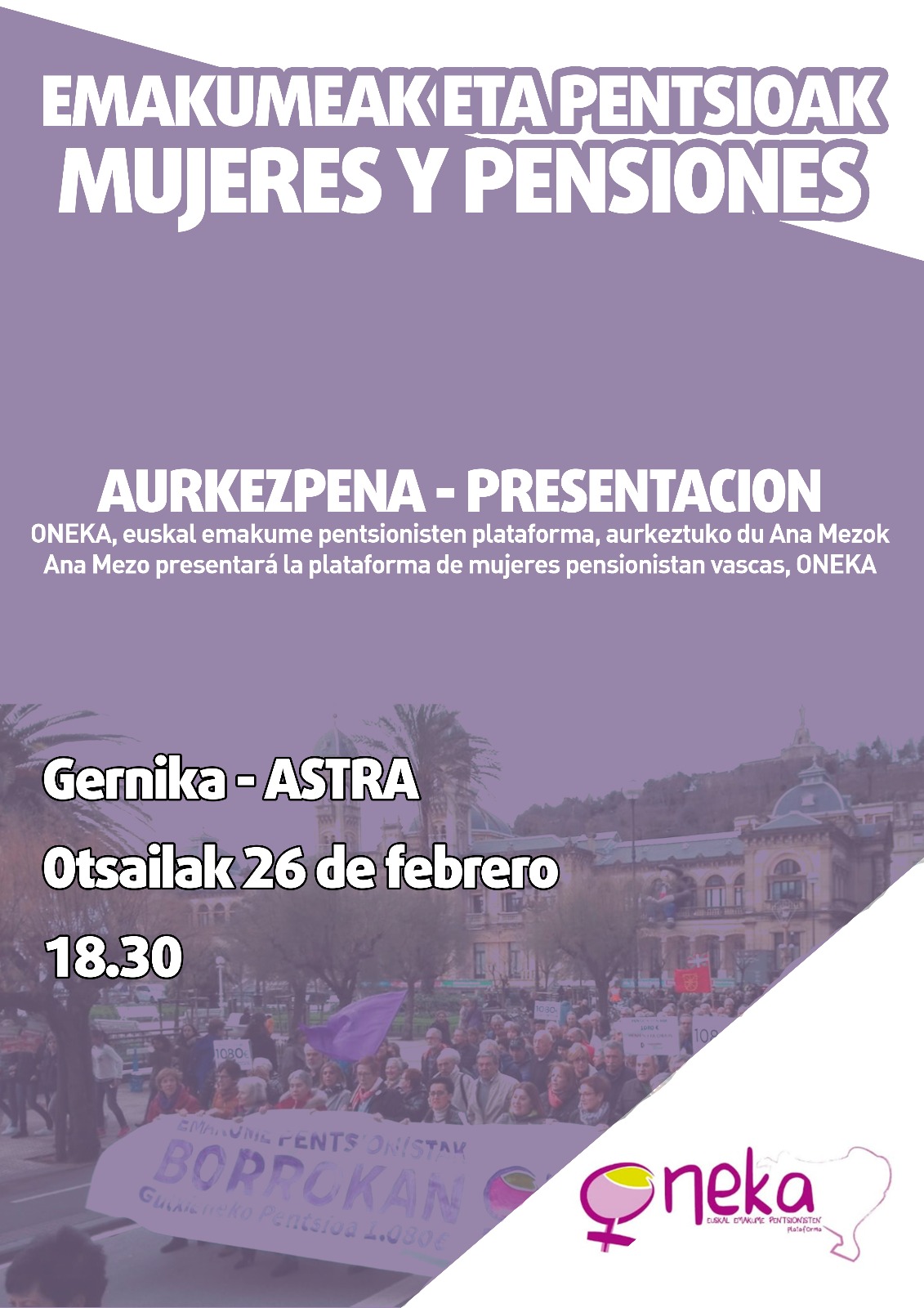 Emakumeak eta pentsioak. ONEKA, euskal emakume pentsionisten plataformaren aurkezpena. Otsailaren 26an, 18:30ean, Astran.
