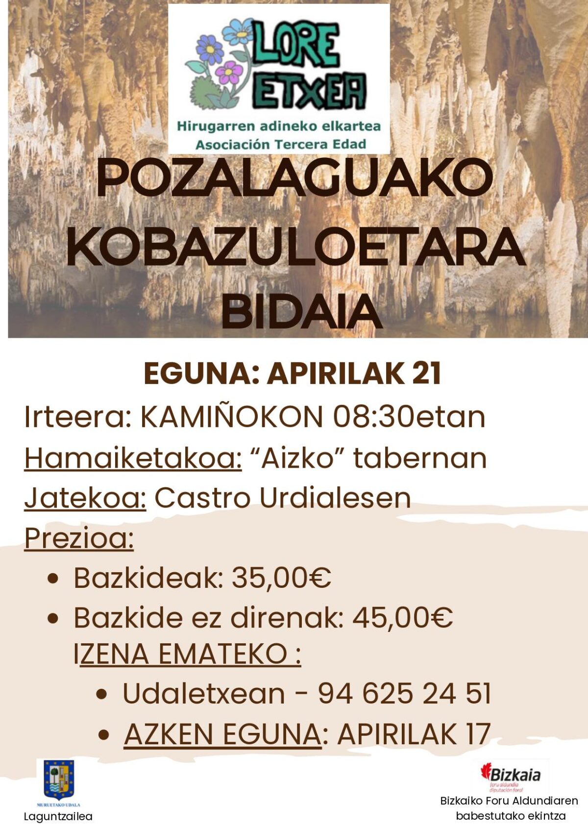 Murueta. Muruetako Hirugarren Adineko Elkarteak udalaren laguntzaz antolatuta, Pozalaguako kobazuloetara irteera egingo dute apirilaren 21ean [martitzena]. Kamiñokotik aterako dira, 08:30ean. Hamaiketakoa Karrantzako Aizko tabernan egingo dute, eta bazkaria, berriz, Castro Urdialesen.