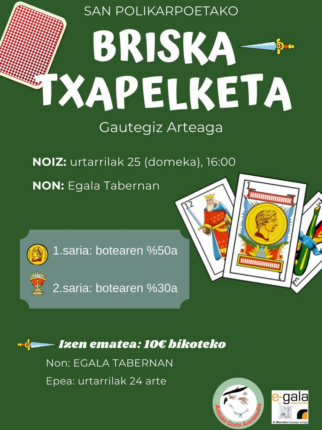 Gautegiz Arteaga. Artiako Gazte Asanbladak antolatuta, San Polikarpo jaietako briska egingo dute urtarrilaren 25an, 16:00retan, Egala tabernan. Izena emateko epemuga urtarrilaren 24 da; bikote bakoitzak 10 euro ordaindu beharko ditu. Lehen saria diruzorroaren %50 izango da; bigarrena, aldiz, %30.