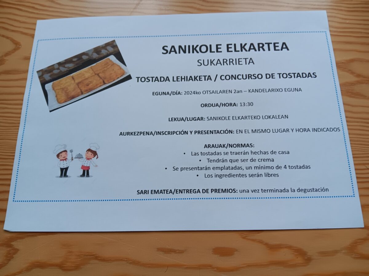 Sukarrieta. Sanikole Elkarteak bultzatuta, tostada lehiaketa egingo dute Sukarrietan kandelerio egunean, otsailaren 2an [barikua], 13:30ean. Lehiaketa Sanikole Elkartearen lokalean izango da, eta izen ematea eta tostaden aurkezpena batera egingo dira.