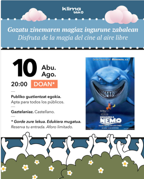 Busturia. BBK Klimak udako zinema saioa eskaini du abuztuaren 10ean [domeka], Busturiko parkeko instalazioetan. Nemoren Bila proiektutatu dute eta saioakoa doakoa bada ere, aurretik sarrera hartu beharko da sarrerak.bbk.eus helbidean.