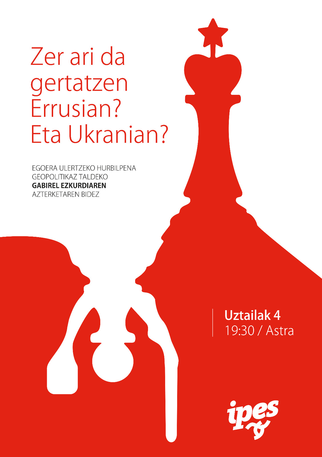 Gernika-Lumo. Errusian eta Ukrainan gertatzen ari dena ulertzeko hitzaldia prestatu du Ipesek uztailaren 4rako (martitzena), 19:00etan. Egoera ulertzeko hurbilpena egingo du Geopolitikaz taldeko Gabirel Ezkurdiak.