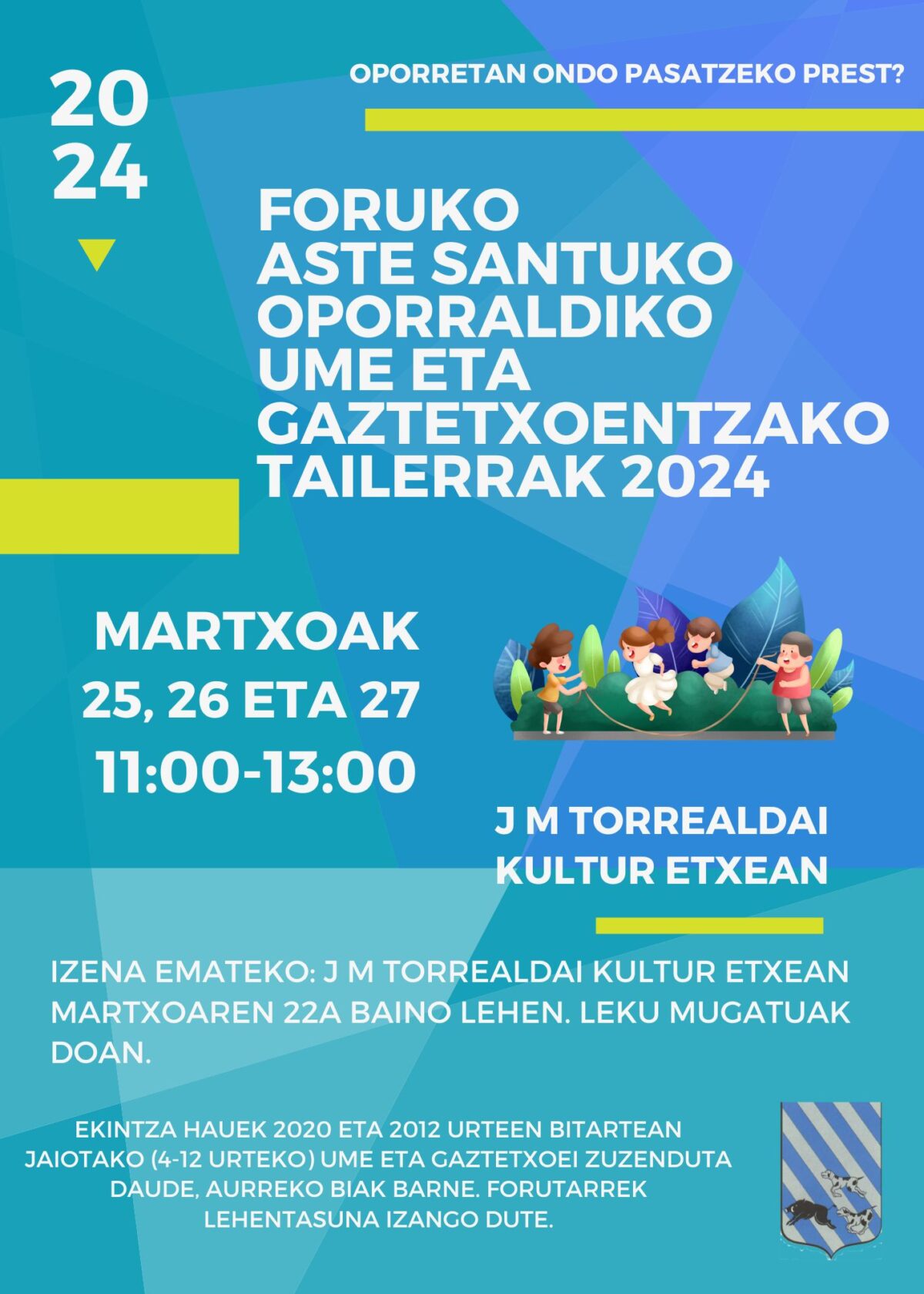Forua. Aste Santuko oporretarako umeentzako eta gaztetxoentzako tailerrak antolatu ditu Foruko Udalak martxoaren 25, 26 eta 27an, J.M. Torrealday Kultur Etxean. Tailerrek bi orduko iraupena izango dute, 11:00etatik 13:00era.