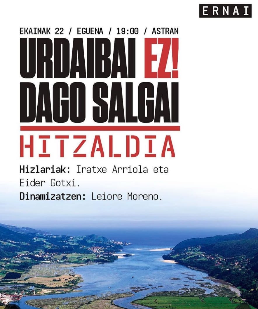 Gernika-Lumo. Ernaik deituta, ‘Urdaibai ez dago salgai’ hitzaldia egingo dute ekainaren 22an (eguena), Astran, 19:00etan. Iratxe Arriola eta Eider Gotxi izango dira hizlariak, eta Leiore Morenok zuzenduko du berbaldia.