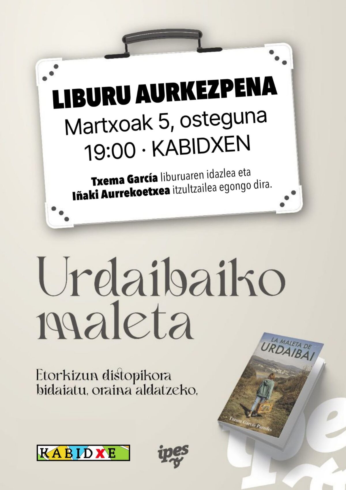 Bermeo. Kabidxe eta Ipesek antolatuta, Urdaibaiko maleta liburuaren aurkezpena egingo dute martxoaren 5ean [eguena], 19:00etan, Kabidxen. Bertan izango dira Txema Garcia liburuaren idazlea eta Iñaki Aurrekoetxea itzultzailea.