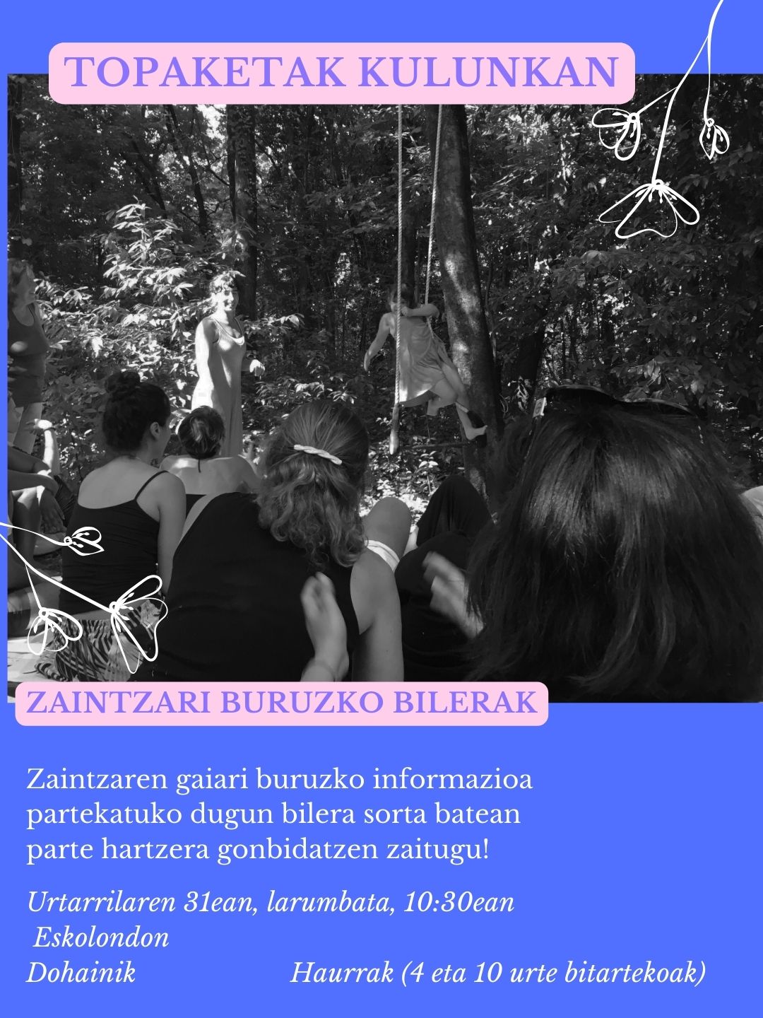 Ea. Zaintzari buruzko bilerak antolatu dituzte Ean, haurrentzat zein helduentzat. Desberdintasunaren Laztanak Leire Mesa artistaren proiektu berria da, “Cie. Leire Mesa” Zirku Konpainiak aurkeztua, eta bertan zaintzaren gaia hausnartzen dugu. Barikuan helduentzako jarri dute hitzordua; zapatuan, berriz, haurrentzako.