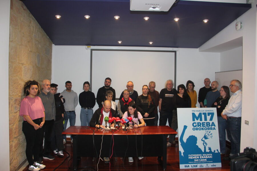 ELA, LAB, Steilas, Hiru eta Etxalde sindikatuek gutxieneko soldata propioa aldarrikatzeko martxoaren 17rako [martitzena] deituta duten greba orokorreko batzordeetan parte hartzeko konpromisoa berretsi dute eragileek. Herritarrei mobilizazioetan parte hartzeko deia luzatu die.