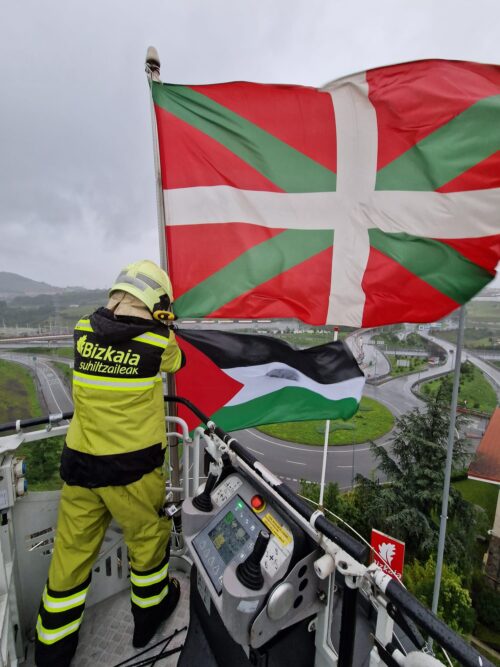 Kezka horrek bueltatu gintuen zerbait egin beharraren ideiara. Berriro gure lankideen artean bozketa egin, eta gehiengo argiz erabaki genuen banderak parkeetan berrezartzea. Urriaren 15ean sindikatu nagusiek egindako deialdiarekin bat eginez, Bizkaiko suhiltzaile parkeetako mastetan Palestinar banderak azaldu ziren beste behin. Udazkeneko hego haizeak gogor astindu ditu gure banderak. Eta ekarri dizkigu lagunen animo eta maitasun mezuak. Elkartasun hauts horretatik zerbait barreiatuko al da Gazako umeen eskuetara?