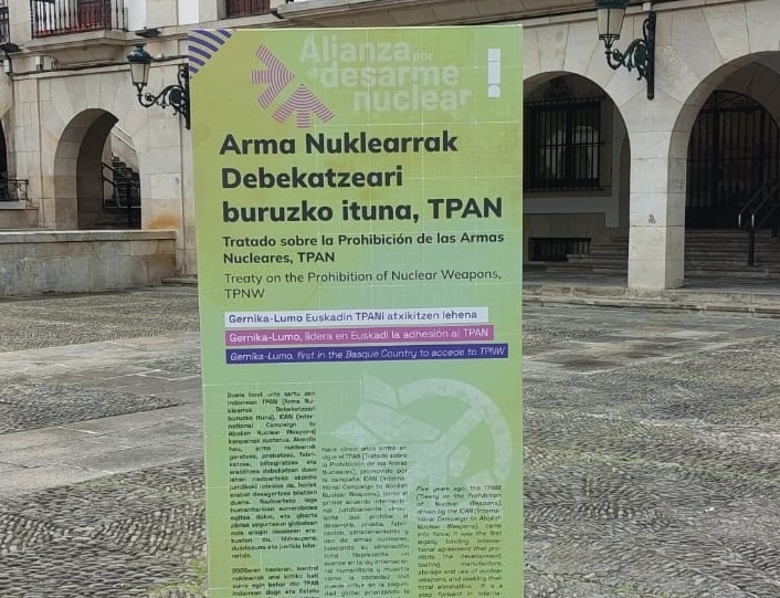 Bizkai, Araba eta Gipuzkoan Arma Nuklearrak Debekatzeko Itunean (TPNA) atxikitu den lehenengo udala izan da Gernika-Lumokoa. Hori dela eta, herritarrak gai horri buruz interpelatzeko elementua kokatu dute Foruen plazan.